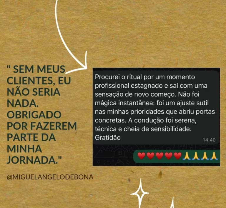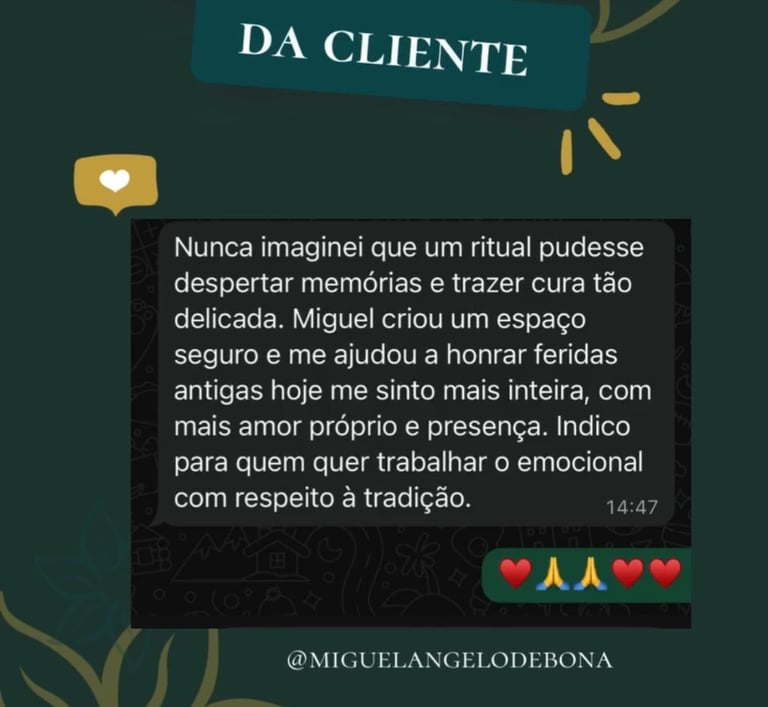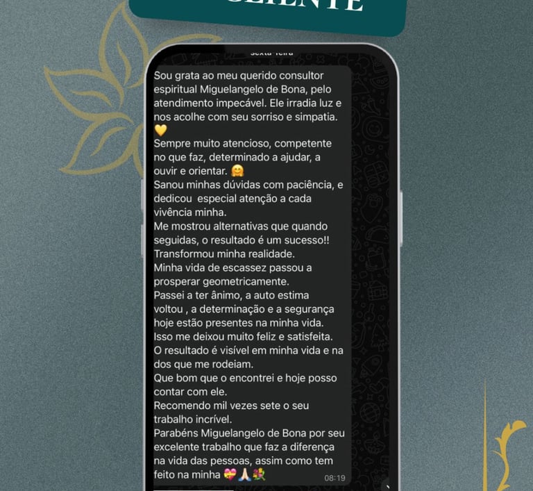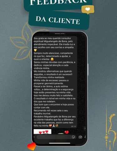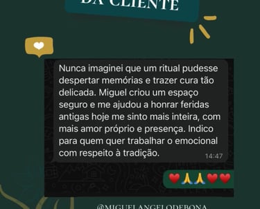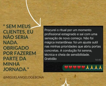 Cada consulta é conduzida com seriedade, respeito e confidencialidade, criando um espaço seguro para reflexão, autoconhecimento e direcionamento espiritual.Atualmente, Miguelangelo realiza atendimentos online para pessoas de todo o Brasil, oferecendo consultas profundas e personalizadas através do Tarot.